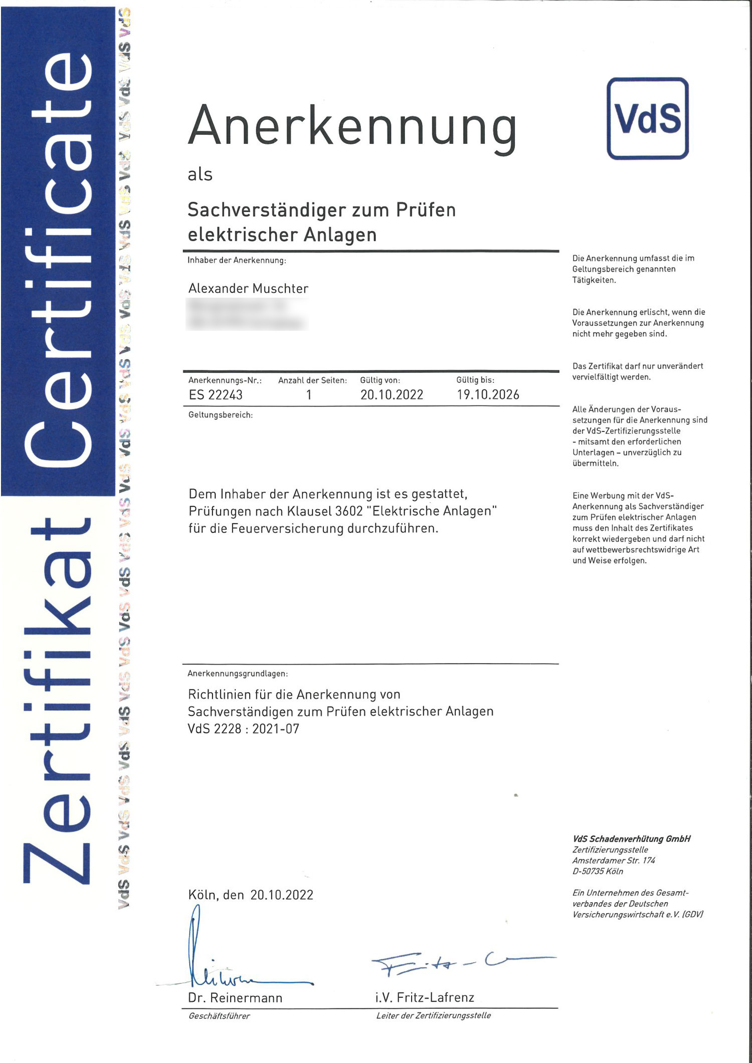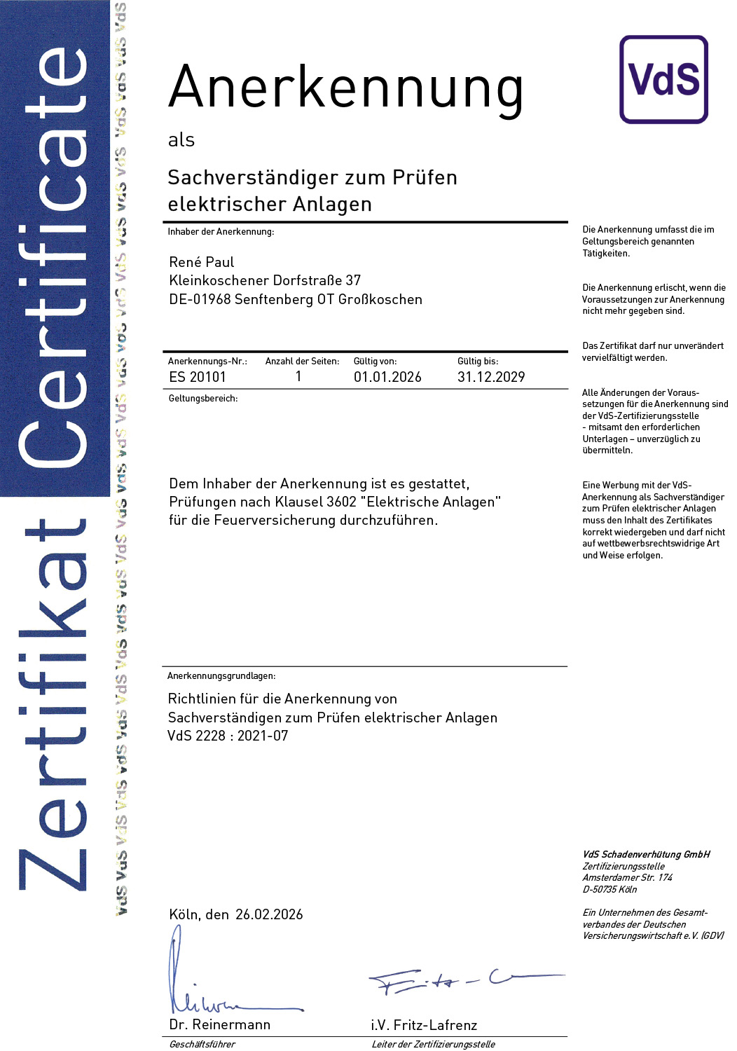 VdS-anerkannter Sachverständiger zum Prüfen elektrischer Anlagen