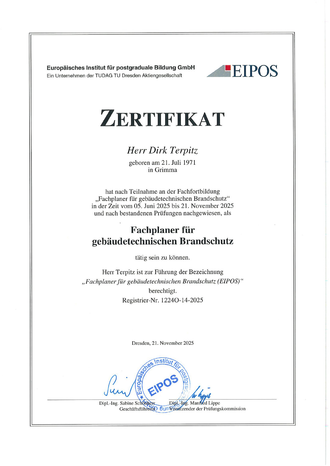 Sachverständiger für brandschutztechnische Bau- und Objektüberwachung (EIPOS)